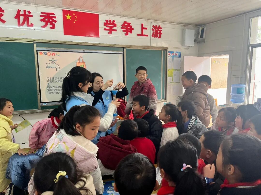 随后的“净水小实验”环节,宣讲团成员将浑浊水样缓缓倒入过滤装置,水流依次经过净化石、瓷砂、活性炭与纱布,渐渐由浊转清。当清澈的水流最终从装置中流出时,教室里响起了热烈的掌声。