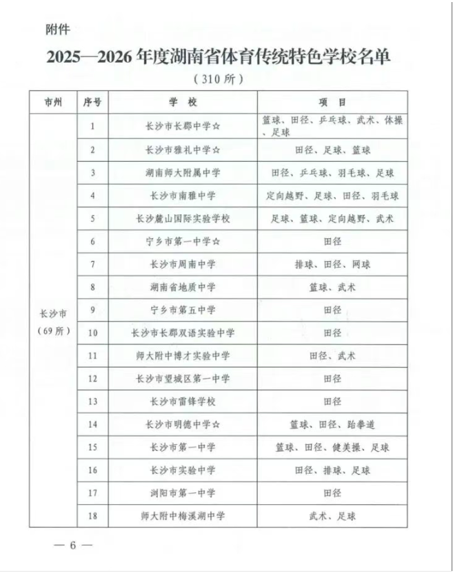 近日,省体育局、省教育厅联合发布2025—2026年度湖南省体育传统特色学校认定结果。经严格复核评审,长沙市长郡中学等310所学校、共408个项目成功入选。其中,南县第一中学、南县城西中学、南县立达中学3所学校入选。