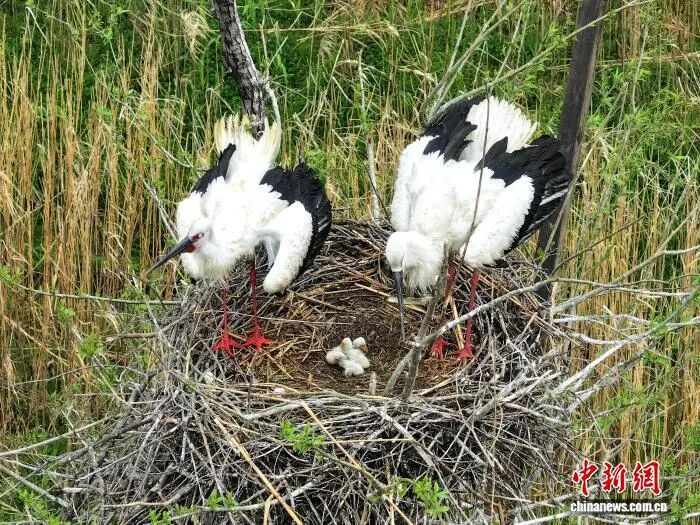 3月18日,南洞庭湖自然保护区舵杆洲区域,东方白鹳孵化出三只幼鸟。 高宏 摄