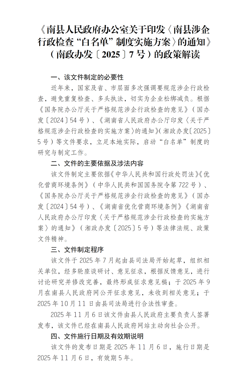 图解:《南县人民政府办公室关于印发〈南县涉企行政检查“白名单”制度实施方案〉的通知》(南政办发〔2025〕7号)的政策解读