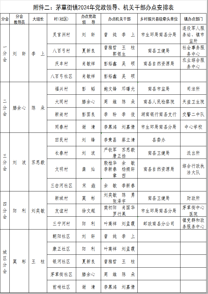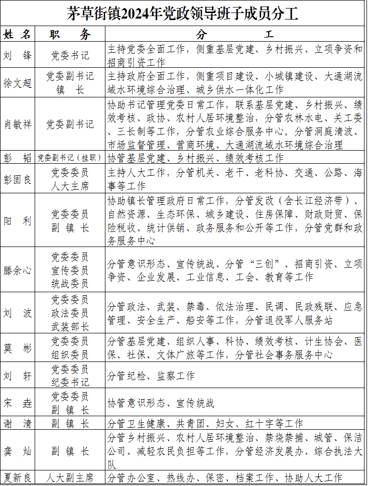 经镇党政会议研究,对镇党政领导班子成员的分工党政领导、机关干部办点安排表进行了调整。现将调整后的《茅草街镇2024年党政领导班子成员分工》和《茅草街镇2024年党政领导、机关干部、县、镇部门办点安排表》印发给你们,请党政领导和机关干部对照安排表及时做好工作对接。