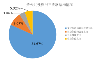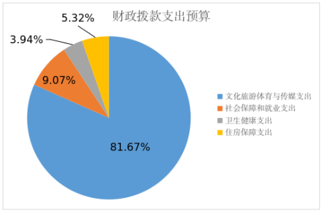 文化旅游体育与传媒支出592.75万元,占比81.67%;社会保障和就业支出65.84万元,占比9.07%;卫生健康支出28.62万元,占比3.94%;住房保障支出38.58万元,占比5.32%。