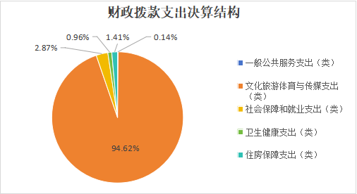 2024年度财政拨款支出2141.99万元,主要用于以下方面:一般公共服务支出(类)2.99万元,占0.14%;文化旅游体育与传媒支出(类)2026.8万元,占94.62%;社会保障和就业支出(类)61.56万元,占2.87%;卫生健康支出(类)20.47万元,占0.96%;住房保障支出(类)30.18万元,占1.41%。