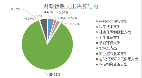 2021年度财政拨款支出23474.89万元,主要用于以下方面:一般公共服务支出1047.78万元,占4.46%;科学技术支出361万元,占1.54%;社会保障和就业支出549.12万元,占2.34%;卫生健康支出134.47万元,占0.57%;节能环保支出39.99万元,占0.17%;农林水支出20121.66万元,占85.72%;商业服务业等支出64万元,占0.27%;自然资源海洋气象等支出40万元,占0.17%;粮油物资储备支出1116.86万元,占4.76%。