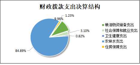 2024年度财政拨款支出2425.88万元,主要用于以下方面:社会保障和就业支出(类)75.06万元,占3.10%;卫生健康支出(类)19.91万元,占0.82%;农林水支出(类)2059.36万元,占84.89%;住房保障支出(类)29.91万元,占1.23%;粮油物资储备支出(类)241.64万元,占9.96%。