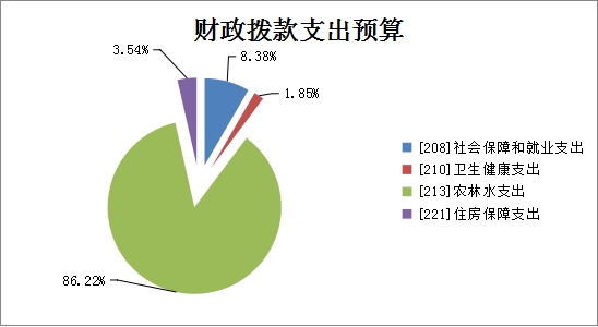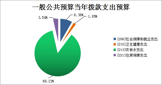 社会保障和就业支出14.19万元,占比8.38%;卫生健康支出3.14万元, 占比1.85%;农林水支出145.98万元、占比86.22%;住房保障支出6万元,占比3.54%。