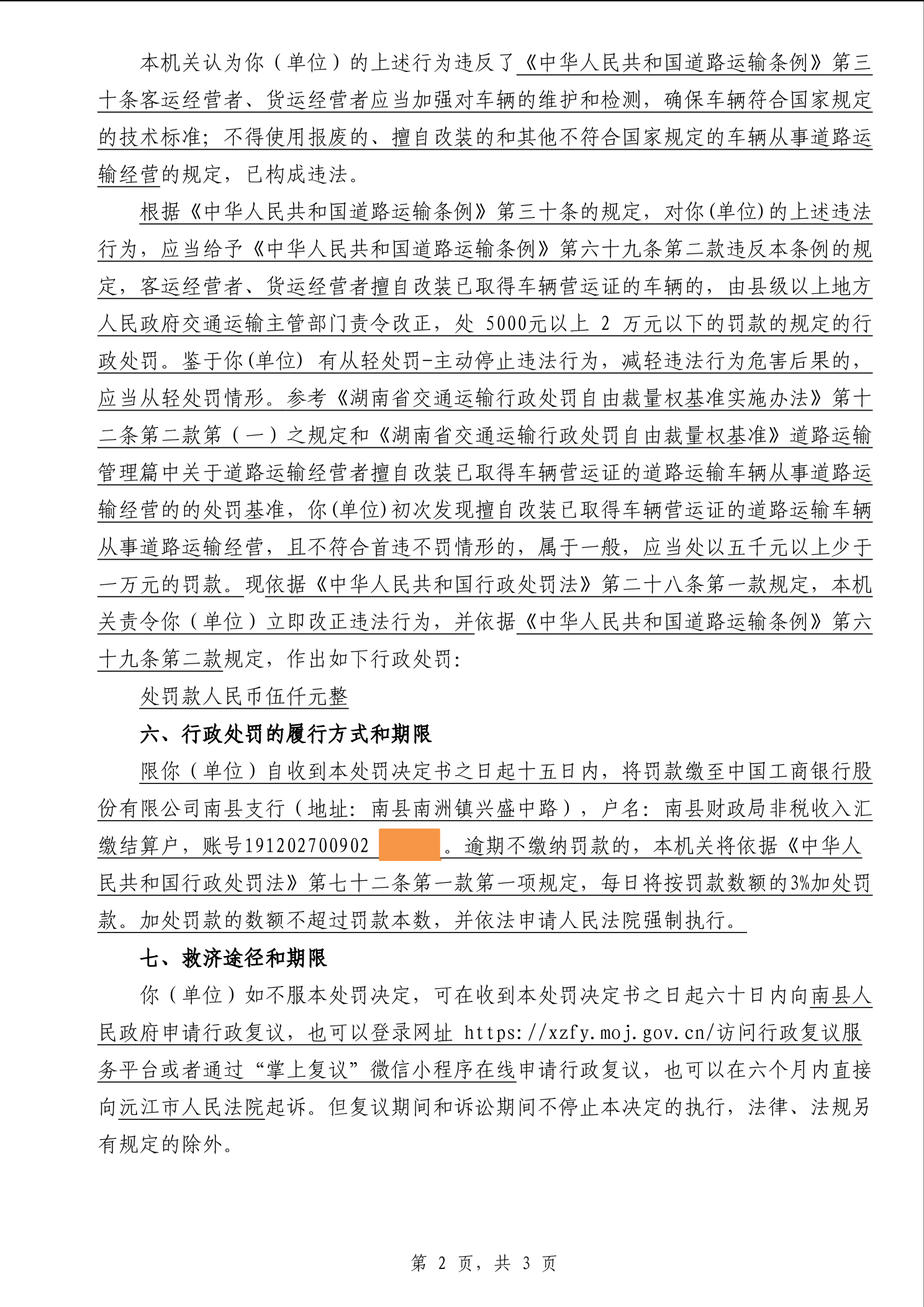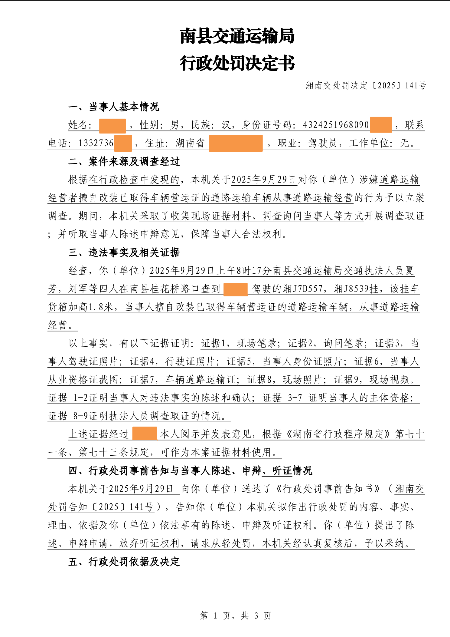 南县交通运输局行政处罚决定书湘南交处罚决定〔2025〕141号