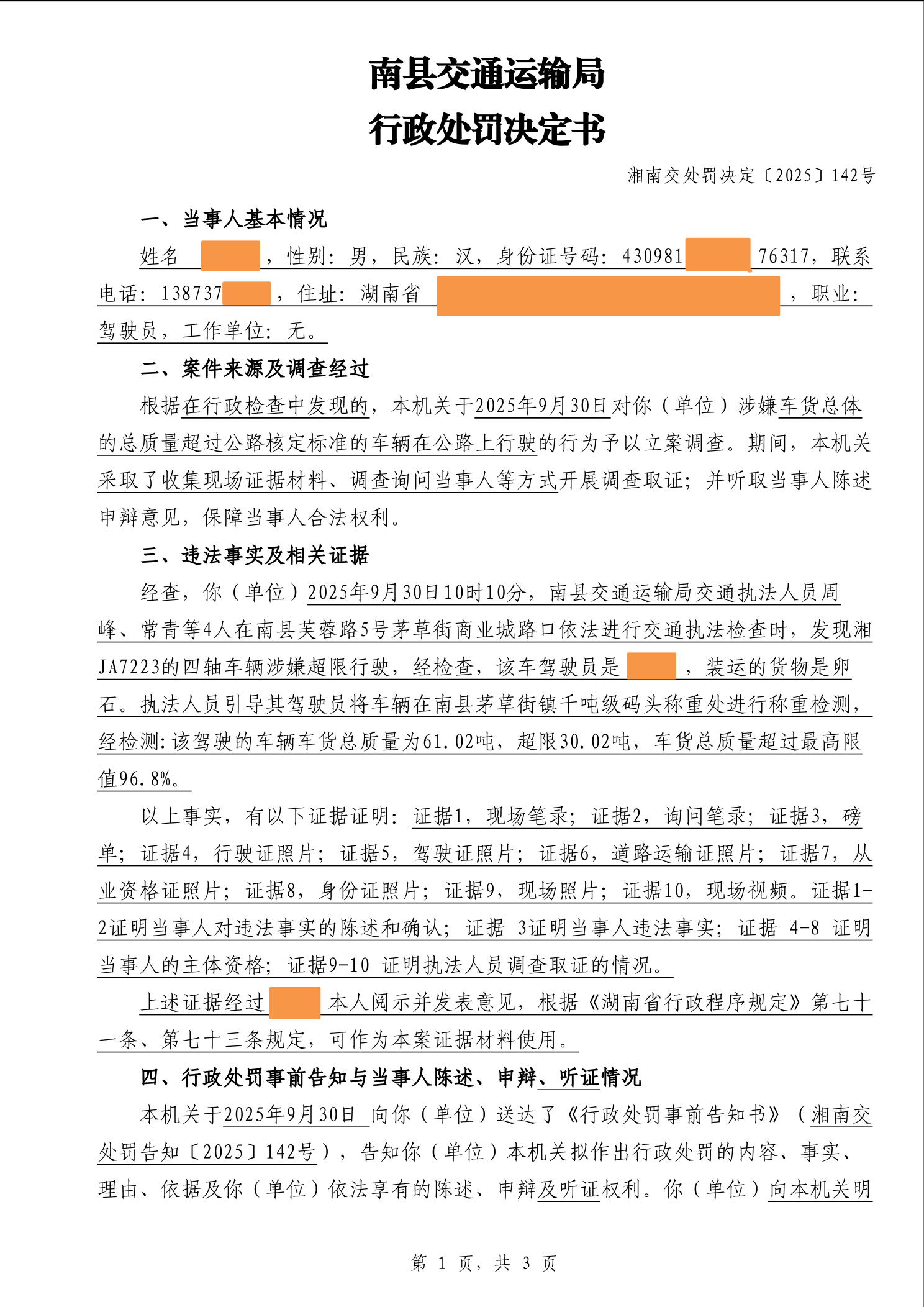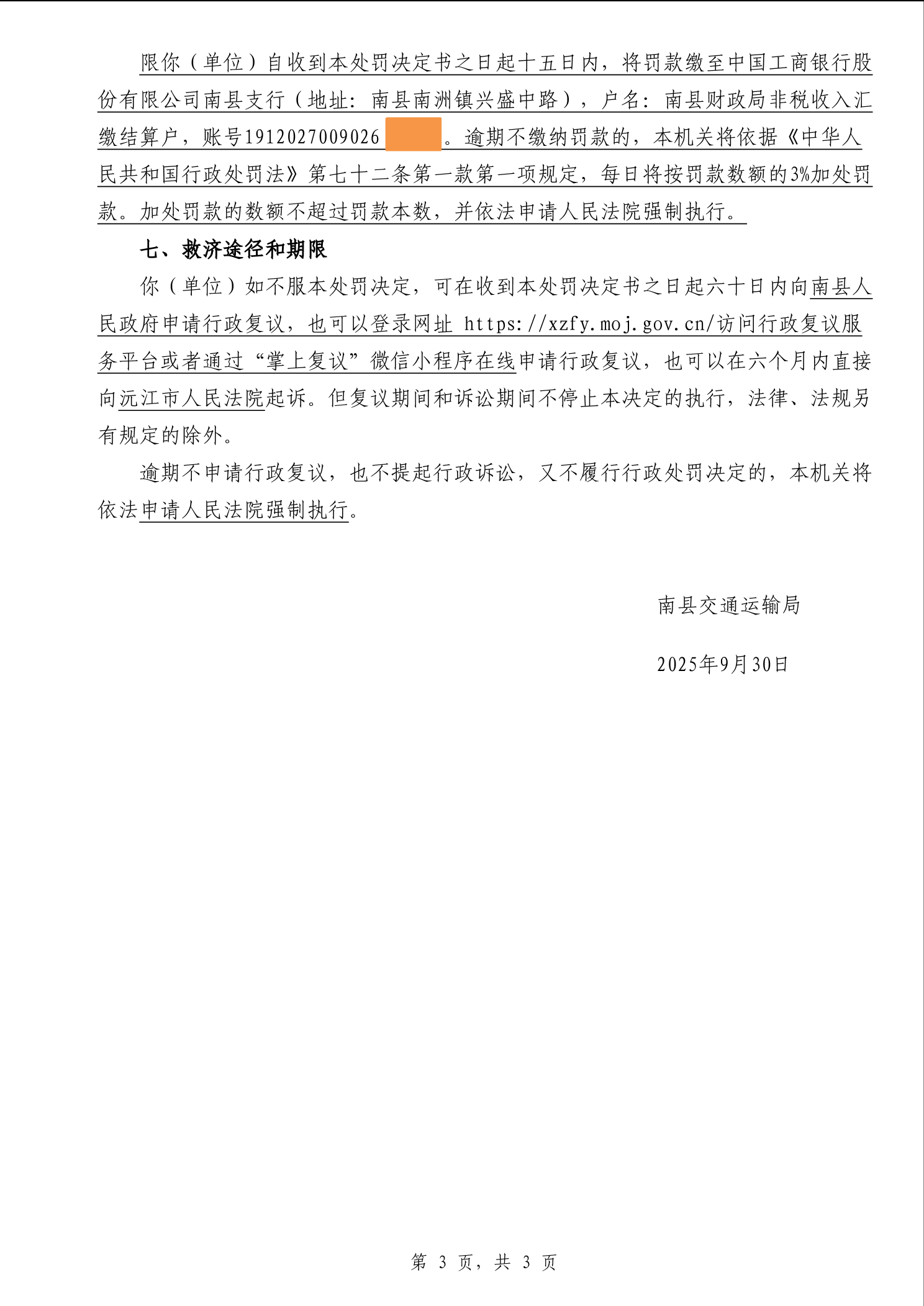 南县交通运输局行政处罚决定书湘南交处罚决定〔2025〕142号