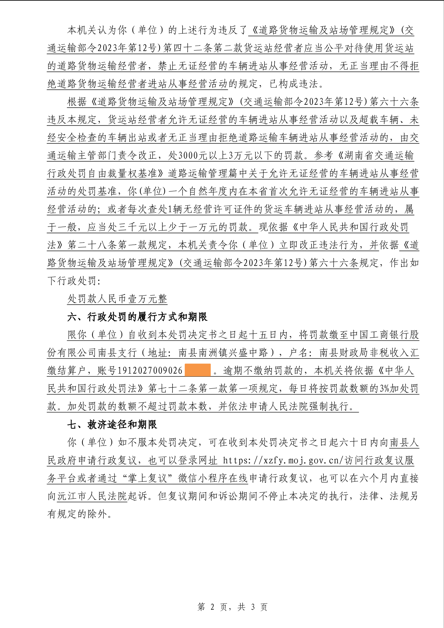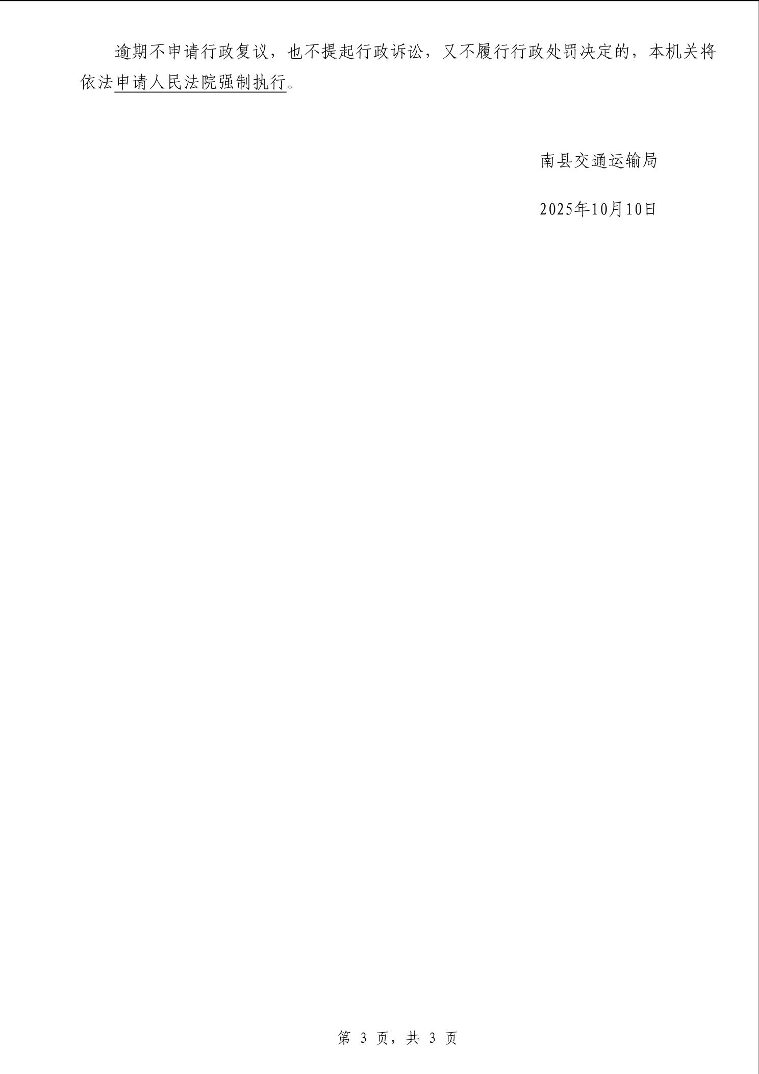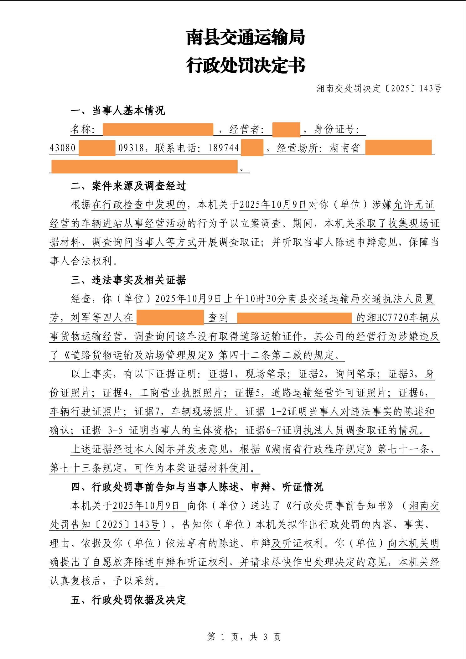 南县交通运输局行政处罚决定书湘南交处罚决定〔2025〕143号