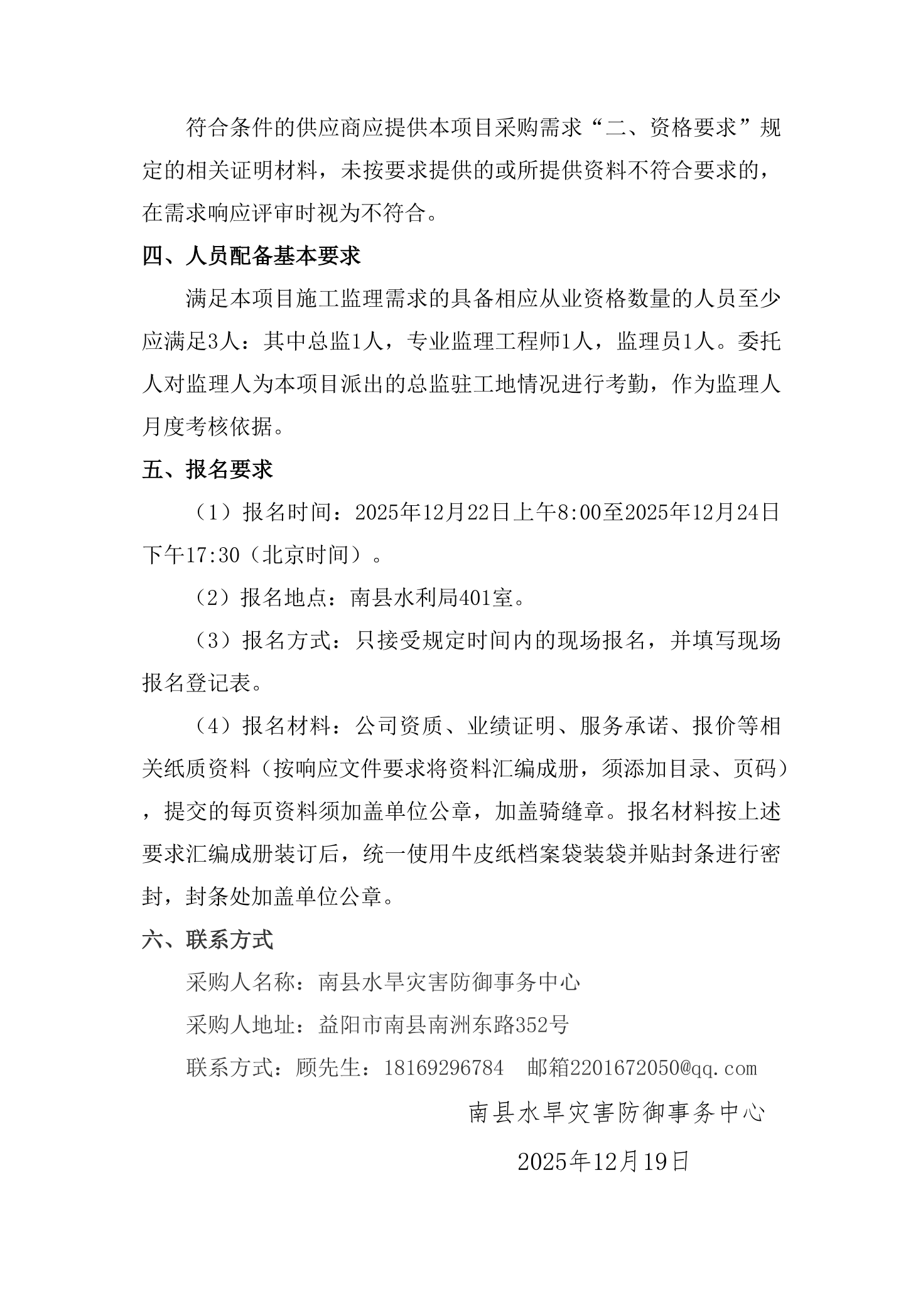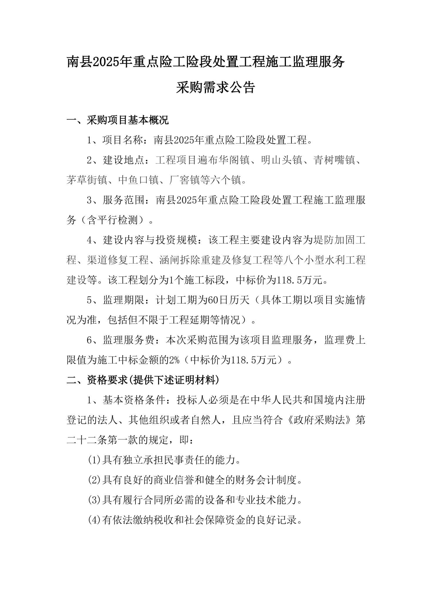南县2025年重点险工险段处置工程施工监理服务采购需求公告