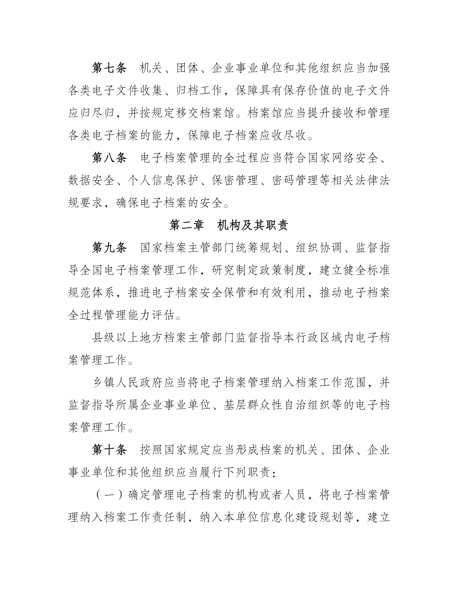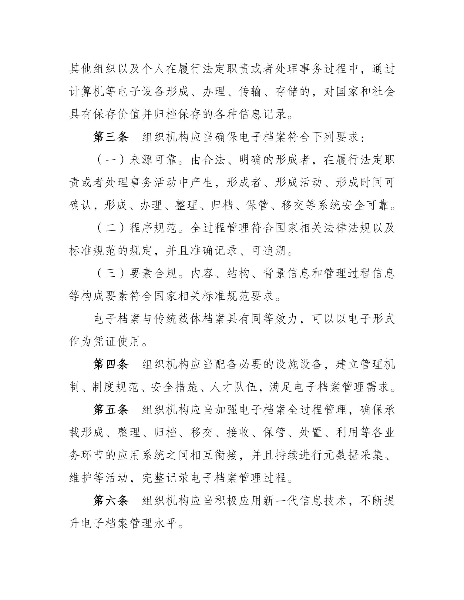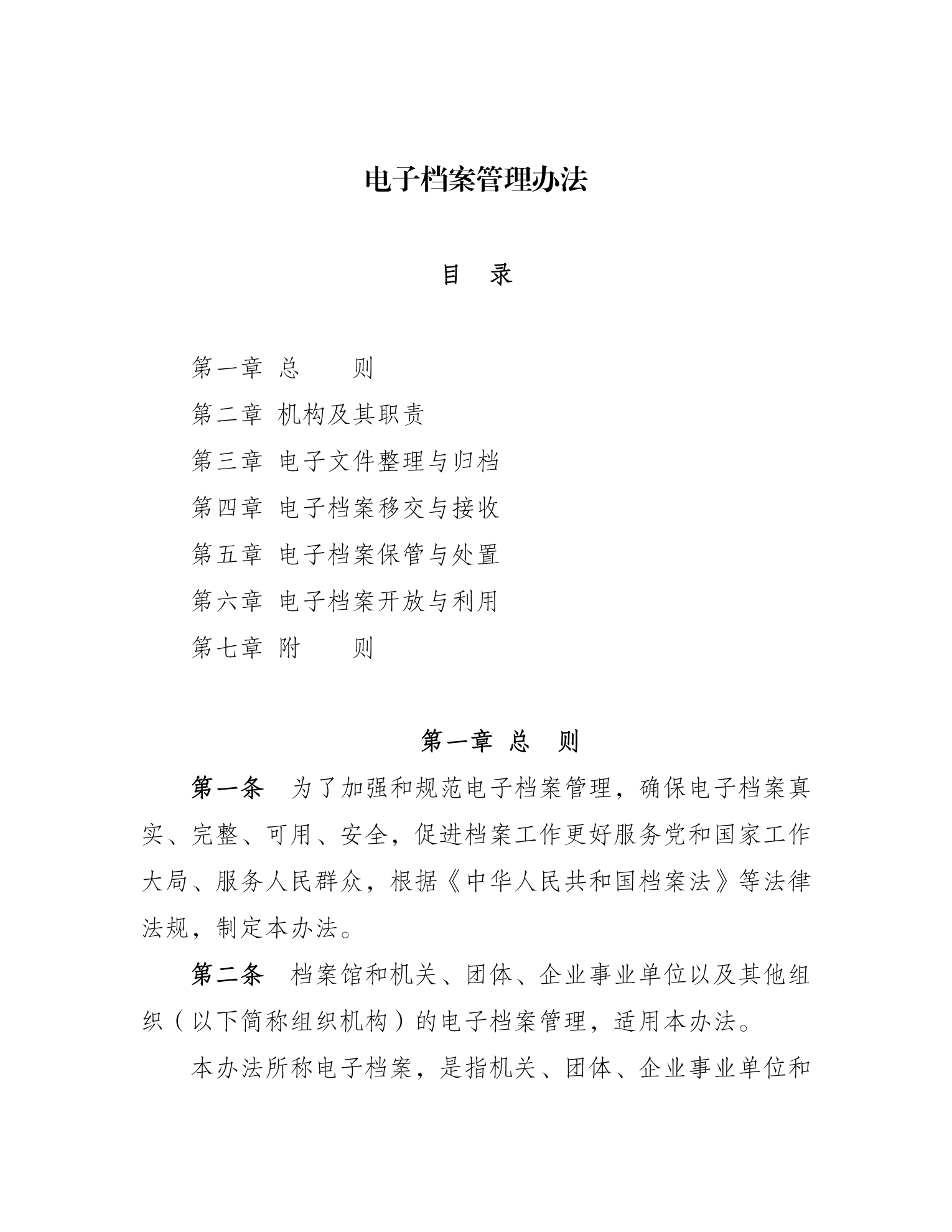 《办法》共七章三十八条。明确了电子档案的定义及“来源可靠、程序规范、要素合规”的具体要求和全过程管理原则。规定了档案主管部门、电子档案形成单位、档案馆的职责。对电子文件整理与归档、电子档案移交与接收、电子档案保管与处置、电子档案开放与利用等方面提出明确要求。对档案馆和形成档案的机关、团体、企业事业单位以及其他组织规范开展相关工作具有指导意义。