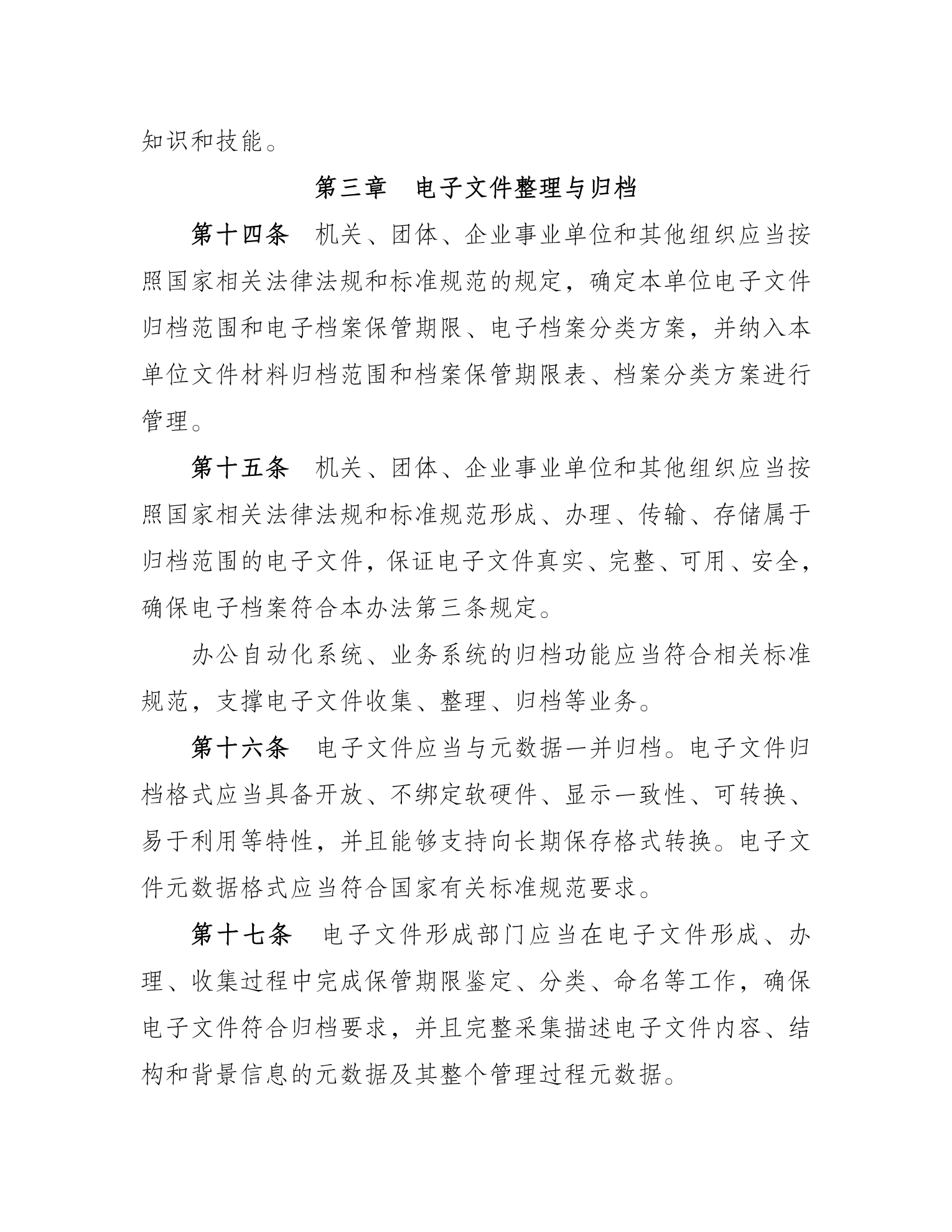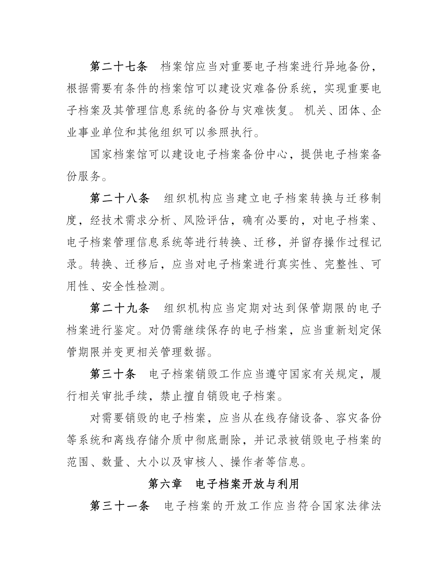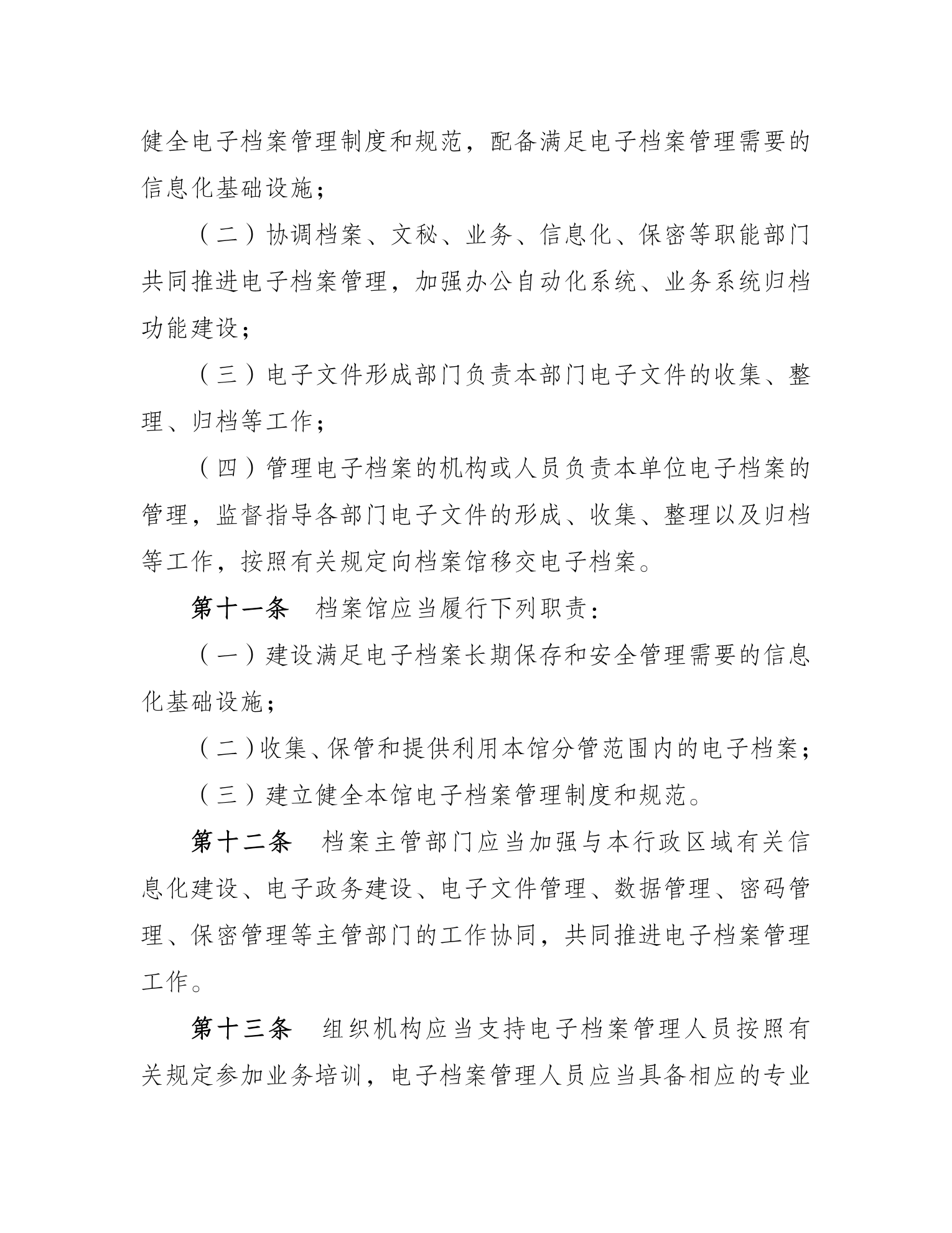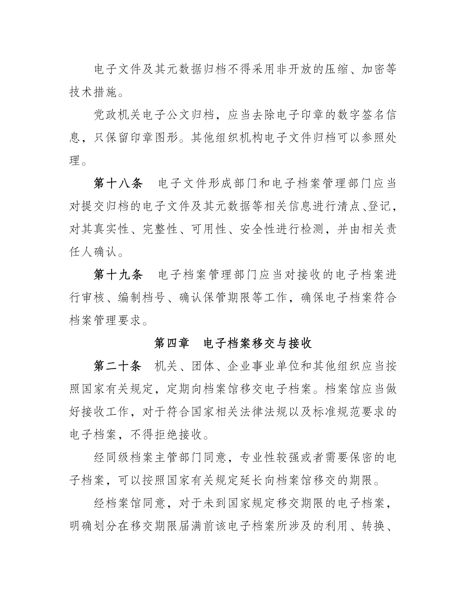 《办法》共七章三十八条。明确了电子档案的定义及“来源可靠、程序规范、要素合规”的具体要求和全过程管理原则。规定了档案主管部门、电子档案形成单位、档案馆的职责。对电子文件整理与归档、电子档案移交与接收、电子档案保管与处置、电子档案开放与利用等方面提出明确要求。对档案馆和形成档案的机关、团体、企业事业单位以及其他组织规范开展相关工作具有指导意义。