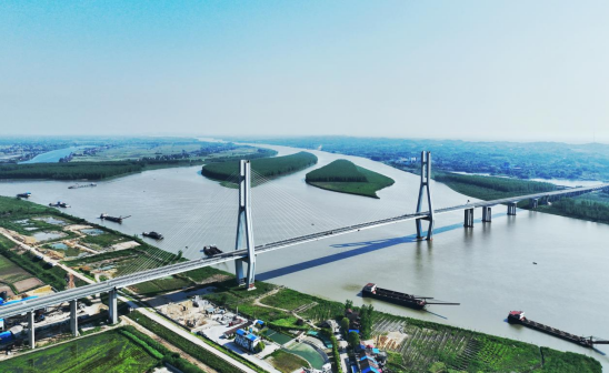 “洞庭飞长虹,天堑变通途”,南洞庭大桥上高高的斜拉索犹如一根根白色琴弦,飞扬在滔滔湖面,奏出华美跨越乐章。