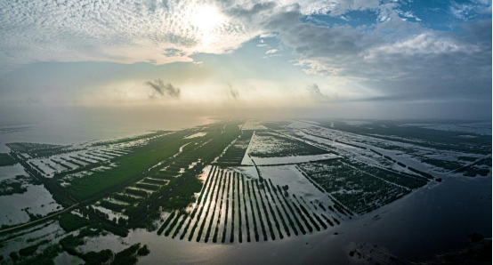 稻田蓄水丰盈,云蒸雾绕,如诗如画,美不胜收。