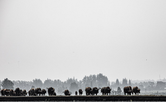 舵杆洲畔,水草葱茏、绿树幽幽,牛群在草地上悠闲地踱步吃草,勾勒出一幅生态和谐的美丽画卷。