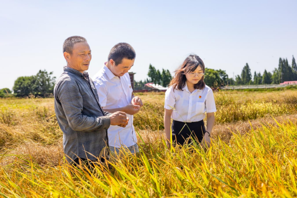 南县纪委监委驻县农业农村局纪检监察组工作人员与农技人员一同走进班嘴村“稻稻虾”核心示范基地,仔细察看早稻长势,以精准有效监督护航夏粮丰产丰收。