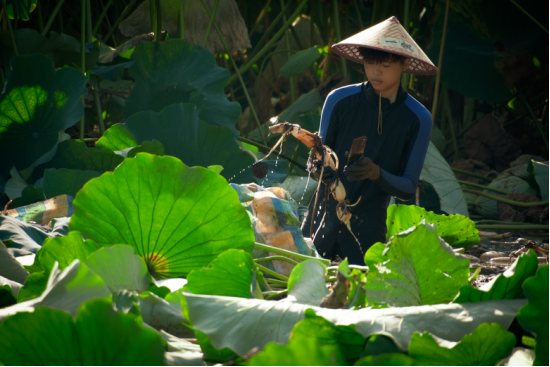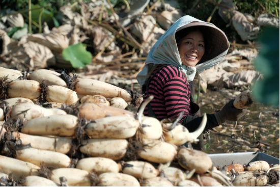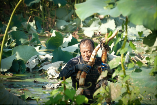 藕农身着连体水裤,弯腰在藕田里探寻藏在淤泥里的鲜嫩莲藕,丰收的喜悦之情溢于言表。