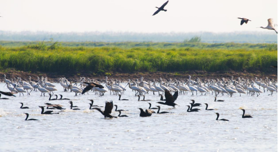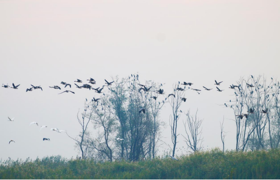 近日,南洞庭湖自然保护区南县舵杆洲区域的候鸟迁徙迎来高峰期,湿地成为鸟儿们迁徙停歇驿站和越冬栖息地,成群结队的豆雁、鸬鹚、苍鹭、白鹭等候鸟陆续飞来“打卡”,成为鸟类栖息和迁徙的乐园。
