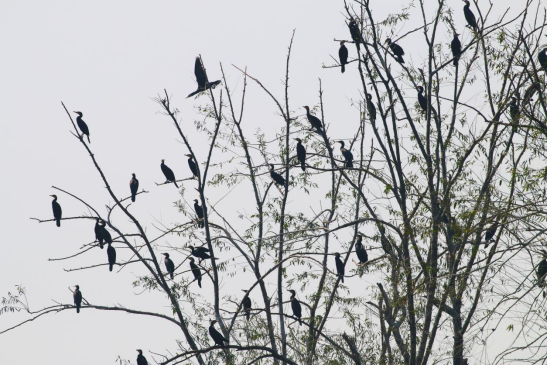 鸬鹚伫立在水中的枯树干上,成为冬日里一道生态风景线。