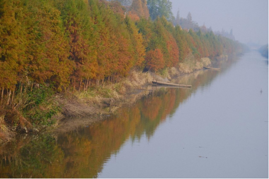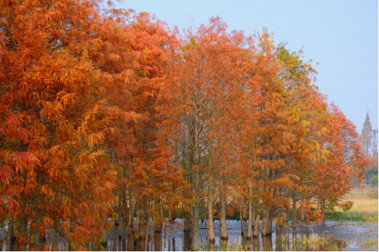 密集的落羽杉不断地“变装”,或翠绿,或金黄,或橘红,美不胜收。