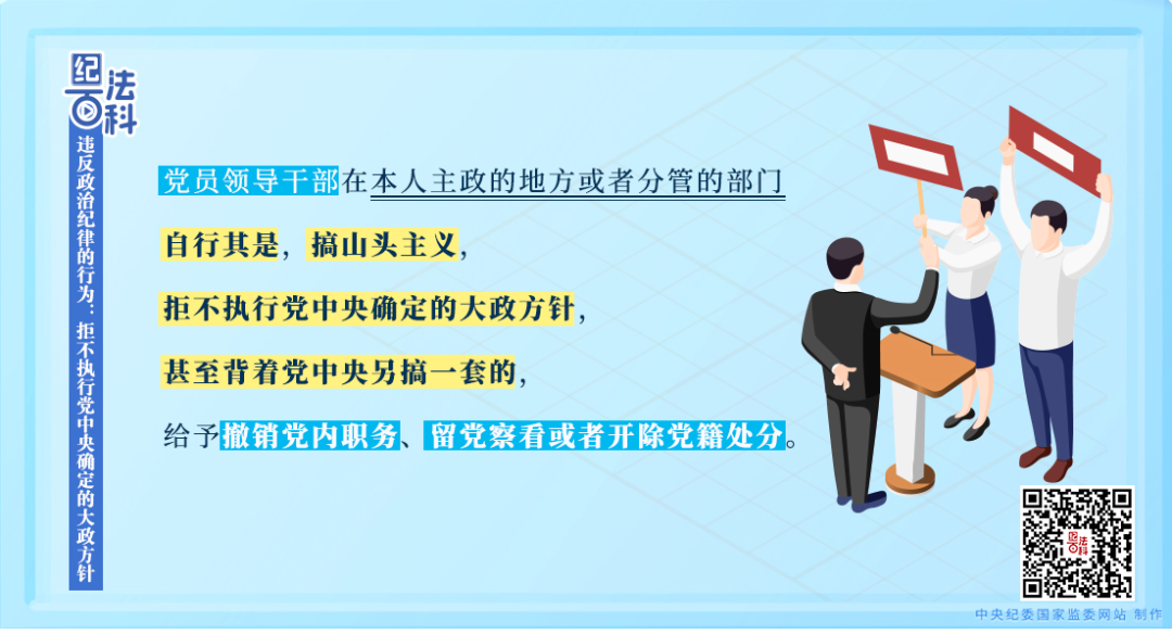 《中国共产党纪律处分条例》第五十六条第一款规定,党员领导干部在本人主政的地方或者分管的部门自行其是,搞山头主义,拒不执行党中央确定的大政方针,甚至背着党中央另搞一套的,给予撤销党内职务、留党察看或者开除党籍处分。